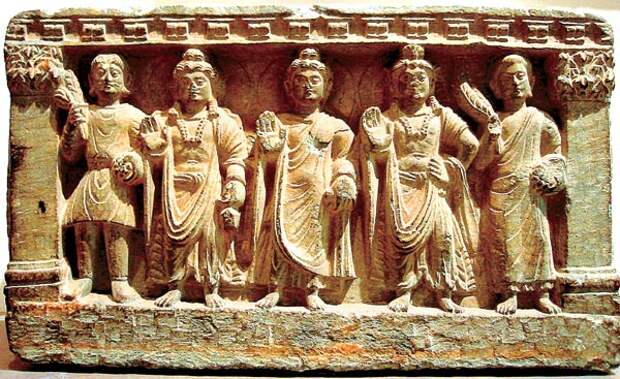 ![]() Барельеф из Гандхары, одной из кушанских провинций (сегодня она поделена между Афганистаном, Пакистаном и Индией). Слева направо: кушан за молитвой, Бодхисатва Майтрея, Будда Шакьямуни, Бодхисатва Авалокитешвара, буддистский монах |