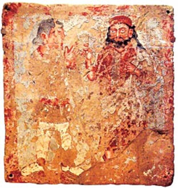 ![]() Настенный рисунок из Бактрии. III век. Высокородному принцу является греческий Зевс — он же египетский Серапис, он же персидский Ахурамазда |