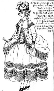 Что касается отделки костюма, то в 1760-1780 женский костюм украшался все больше и больше. Оборки, тесьма, кружево, вышивка, шелковые цветы, лента, тесьма, блестки и т.п. порой перегружали платья, в то время как объем юбки сокращался. Все реже носили юбки на обручах и панье, а вместо них все чаще носили накладные подушечки (false rump, bumroll), придававшие платью объем сзади.